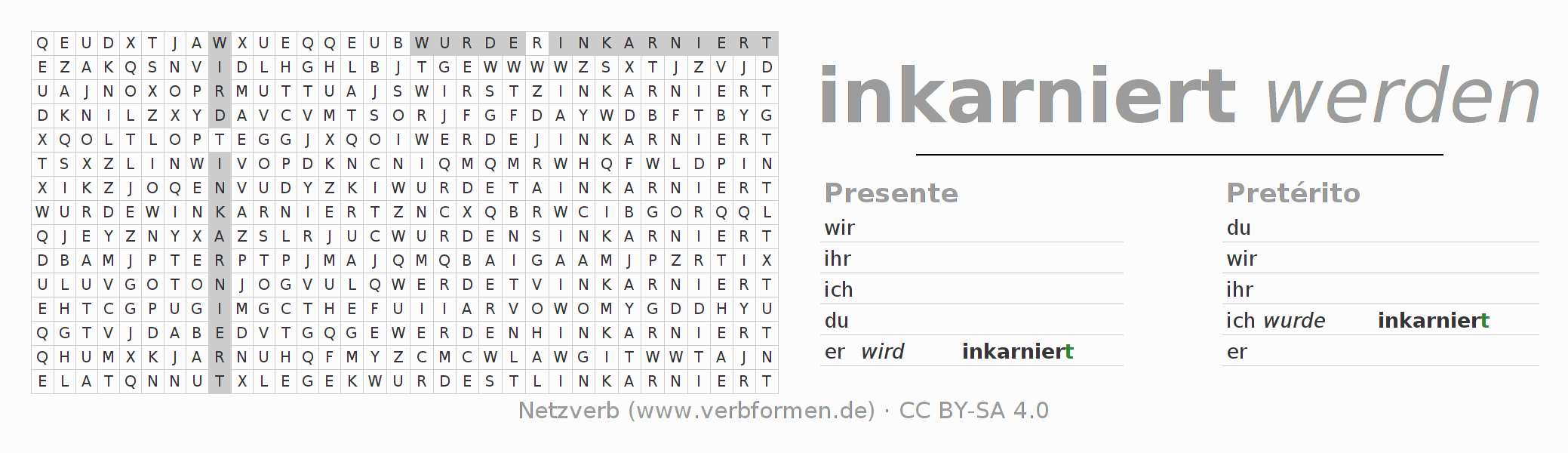 Com o caça-palavras aprende-se de uma forma desafiadora a conjugação do verbo inkarnieren.