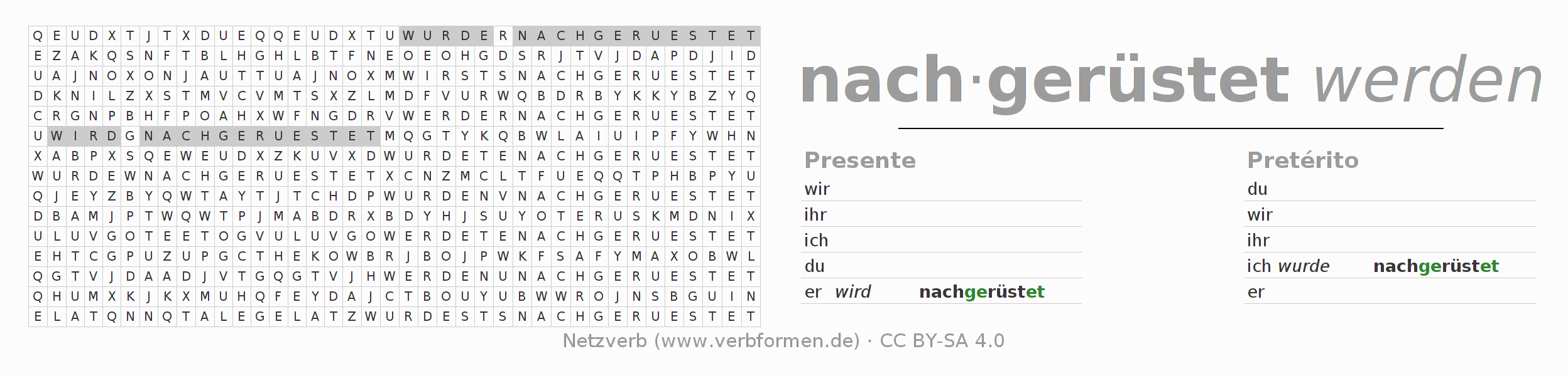 As planilhas são geralmente usadas no ensino para a Conjugação do verbo nachrüsten. Os materiais podem ser utilizados como Recursos Educacionais Abertos (OER) em exercícios, jogos e tarefas (CC BY-SA 4.0). Existem diferentes tipos de tarefas disponíveis para o verbo nachrüsten. Há uma variedade de execícios com uma visão geral e completa da conjugação como por exemplo, caça-palavras e jogos que requerem um aprendizado em conjunto. Todo o material educacional está disponível gratuitamente para download como PDF, como imagem e através uma versão interativa do navegador. Além das tarefas, inúmeros exemplos do verbo nachrüsten também auxiliam na utilização do verbo.