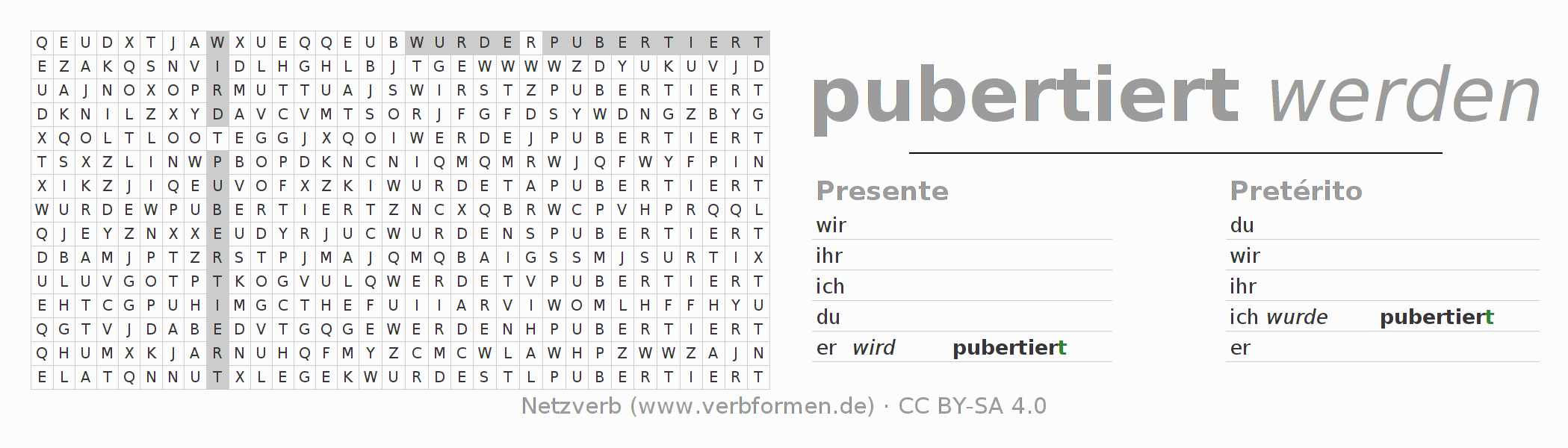Caça-palavras para todas as formas do verbo pubertieren