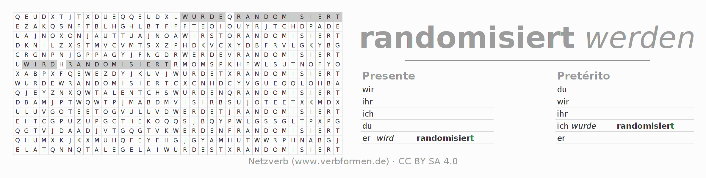 Com o caça-palavras aprende-se de uma forma desafiadora a conjugação do verbo randomisieren.