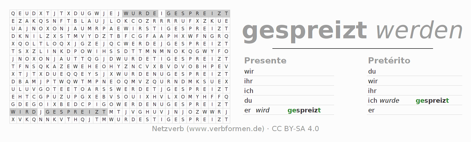 Caça-palavras para todas as formas do verbo spreizen