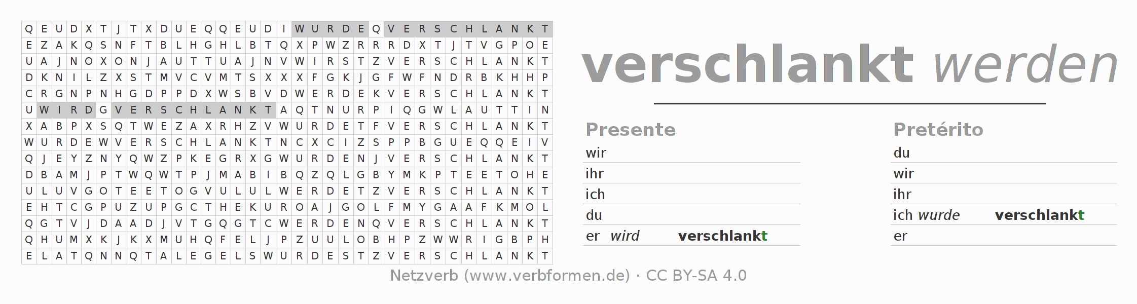 As planilhas são geralmente usadas no ensino para a Conjugação do verbo verschlanken. Os materiais podem ser utilizados como Recursos Educacionais Abertos (OER) em exercícios, jogos e tarefas (CC BY-SA 4.0). Existem diferentes tipos de tarefas disponíveis para o verbo verschlanken. Há uma variedade de execícios com uma visão geral e completa da conjugação como por exemplo, caça-palavras e jogos que requerem um aprendizado em conjunto. Todo o material educacional está disponível gratuitamente para download como PDF, como imagem e através uma versão interativa do navegador. Além das tarefas, inúmeros exemplos do verbo verschlanken também auxiliam na utilização do verbo.