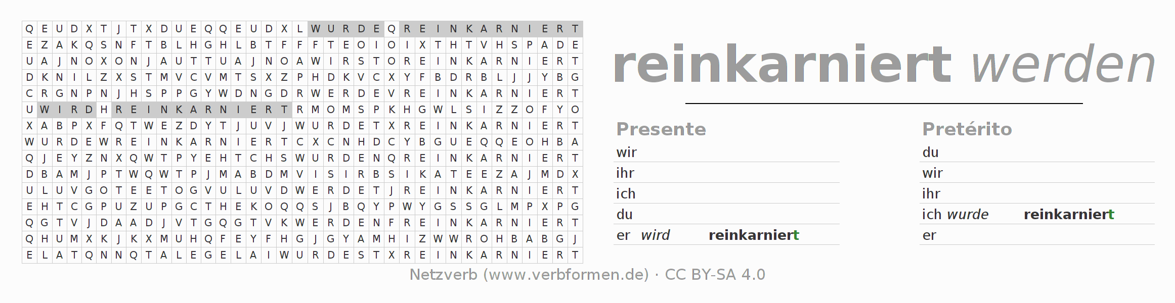 Caça-palavras para todas as formas do verbo reinkarnieren