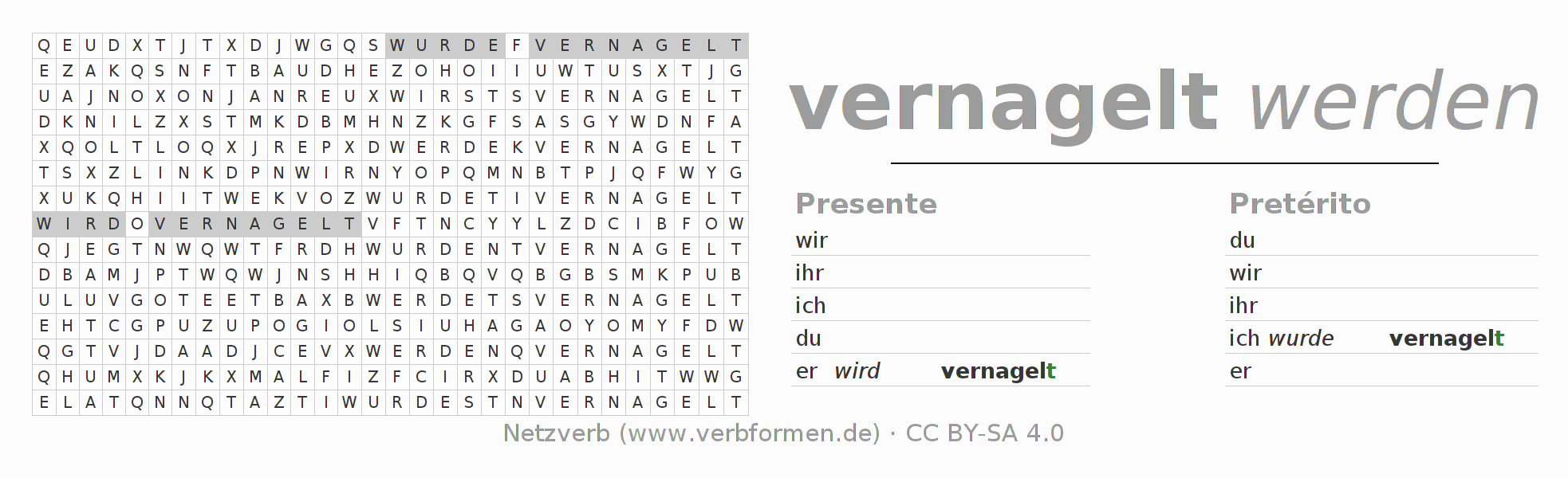 Com o caça-palavras aprende-se de uma forma desafiadora a conjugação do verbo vernageln.