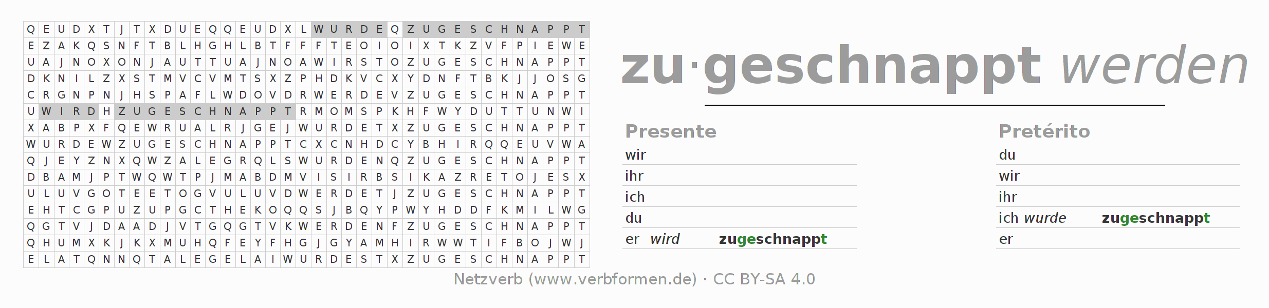 Com o caça-palavras aprende-se de uma forma desafiadora a conjugação do verbo zuschnappen.