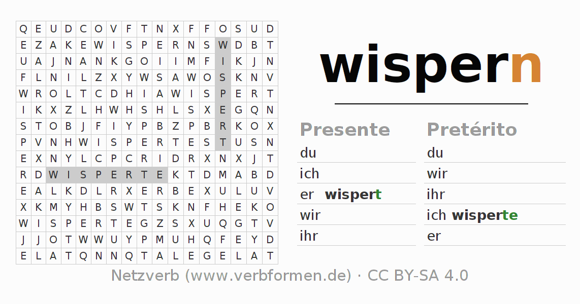 Com o caça-palavras aprende-se de uma forma desafiadora a conjugação do verbo wispern.