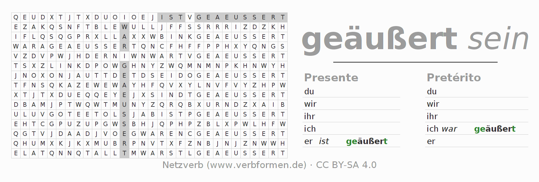 As planilhas são geralmente usadas no ensino para a Conjugação do verbo äußern. Os materiais podem ser utilizados como Recursos Educacionais Abertos (OER) em exercícios, jogos e tarefas (CC BY-SA 4.0). Existem diferentes tipos de tarefas disponíveis para o verbo äußern. Há uma variedade de execícios com uma visão geral e completa da conjugação como por exemplo, caça-palavras e jogos que requerem um aprendizado em conjunto. Todo o material educacional está disponível gratuitamente para download como PDF, como imagem e através uma versão interativa do navegador. Além das tarefas, inúmeros exemplos do verbo äußern também auxiliam na utilização do verbo.