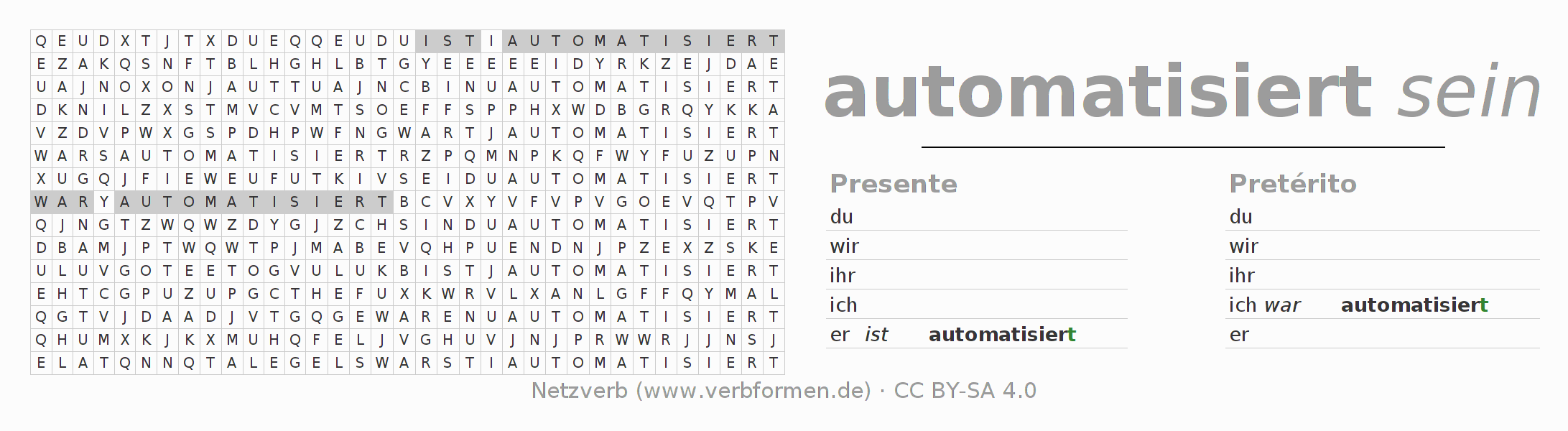 Com o caça-palavras aprende-se de uma forma desafiadora a conjugação do verbo automatisieren.