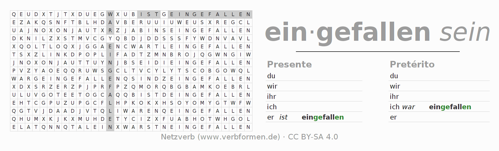 Com o caça-palavras aprende-se de uma forma desafiadora a conjugação do verbo einfallen.