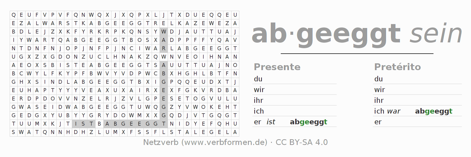 Caça-palavras para todas as formas do verbo abeggen