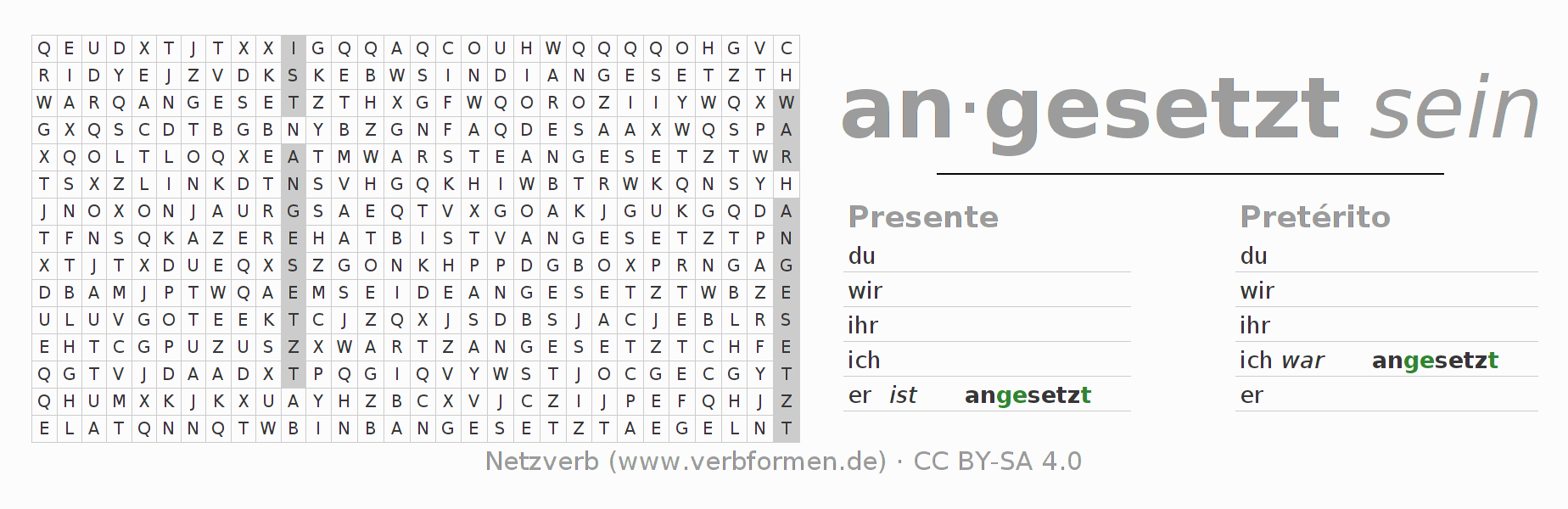 Com o caça-palavras aprende-se de uma forma desafiadora a conjugação do verbo ansetzen.