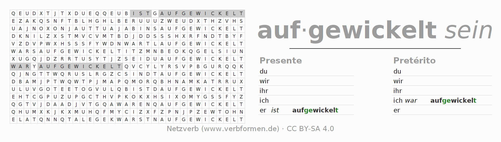 Com o caça-palavras aprende-se de uma forma desafiadora a conjugação do verbo aufwickeln.