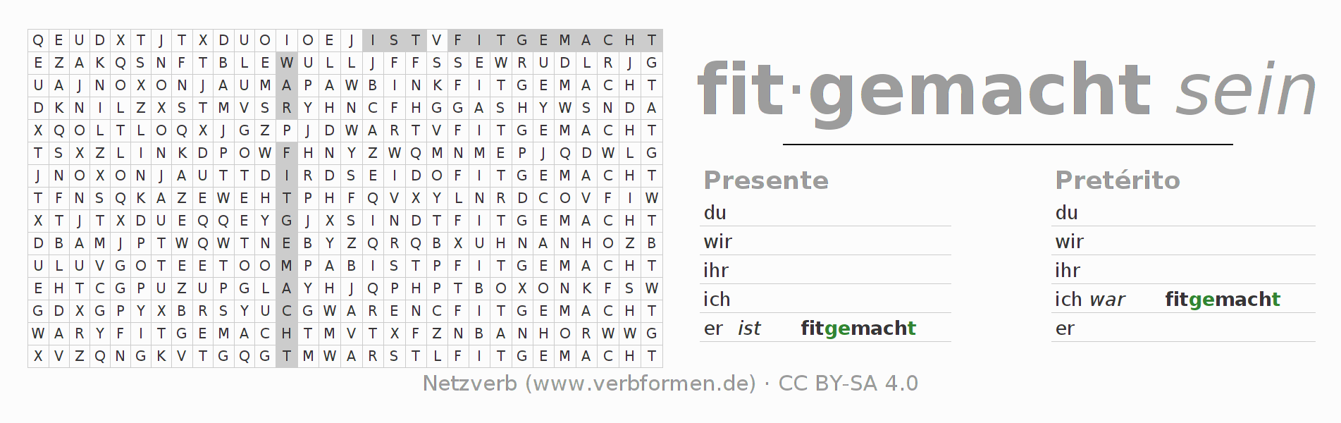 Com o caça-palavras aprende-se de uma forma desafiadora a conjugação do verbo fitmachen.