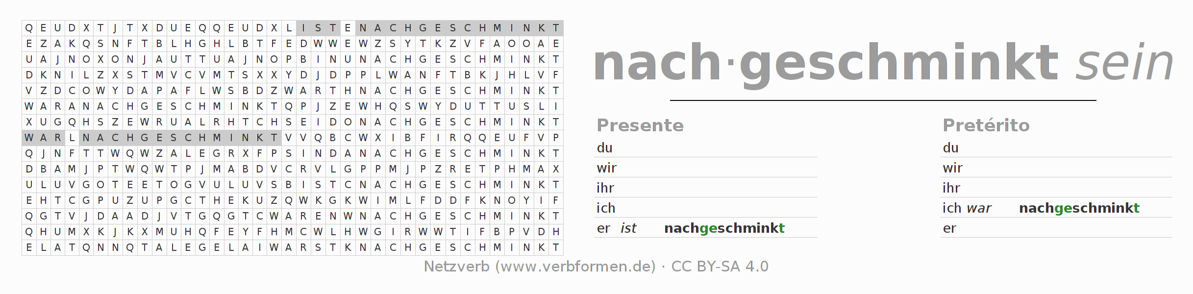A Tabela de verbo resume todas as formas verbais do verbo nachschminken em uma só tabela.