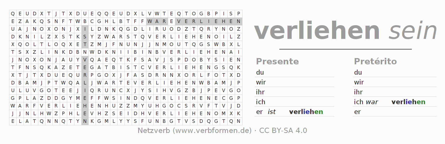Com o caça-palavras aprende-se de uma forma desafiadora a conjugação do verbo verleihen.