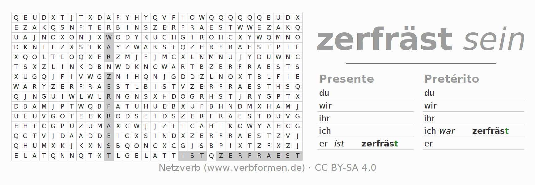 Com o caça-palavras aprende-se de uma forma desafiadora a conjugação do verbo zerfräsen.