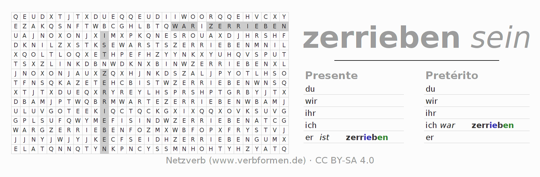Com o caça-palavras aprende-se de uma forma desafiadora a conjugação do verbo zerreiben.