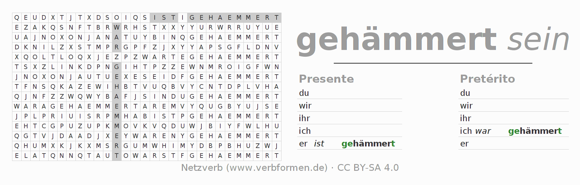 Com o caça-palavras aprende-se de uma forma desafiadora a conjugação do verbo hämmern.