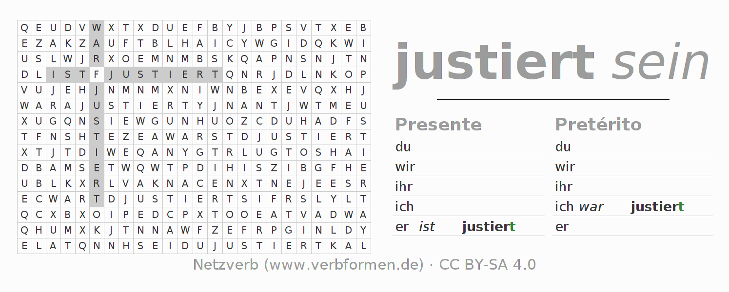 Com o caça-palavras aprende-se de uma forma desafiadora a conjugação do verbo justieren.