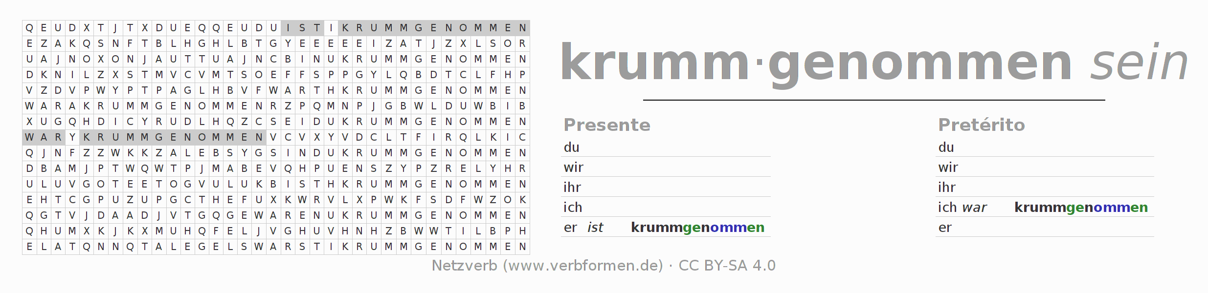 Com o caça-palavras aprende-se de uma forma desafiadora a conjugação do verbo krummnehmen.