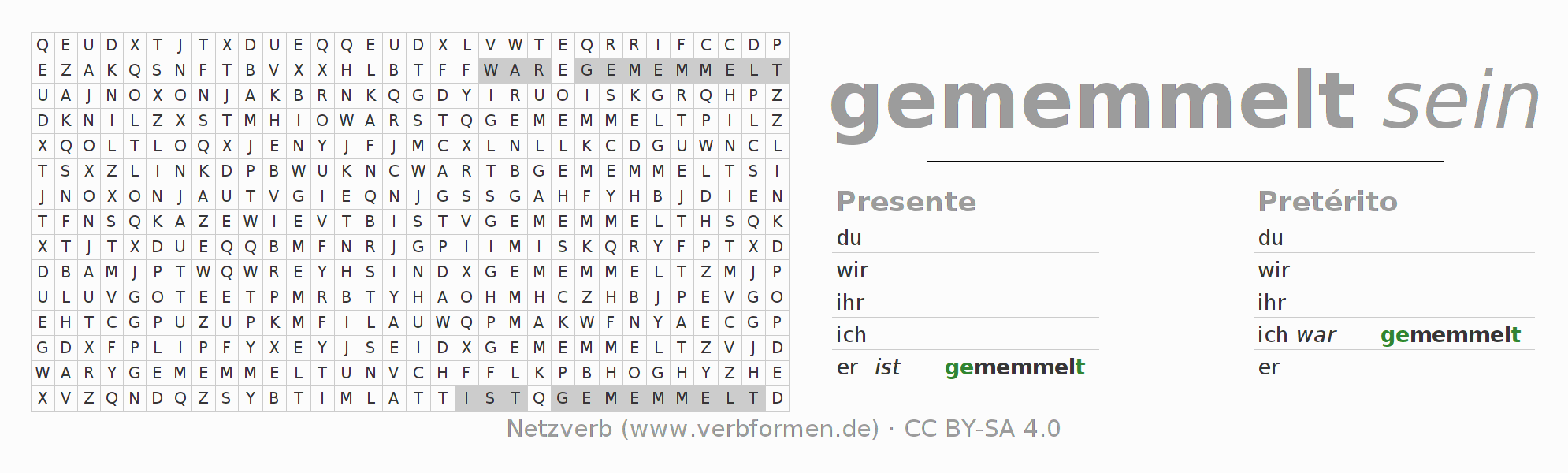 Caça-palavras para todas as formas do verbo memmeln
