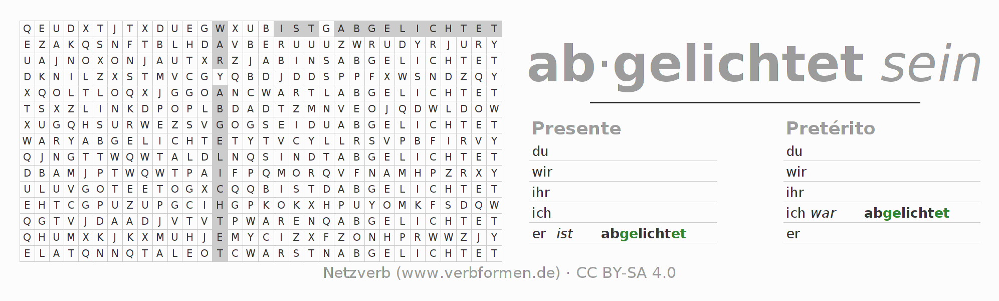 Com o caça-palavras aprende-se de uma forma desafiadora a conjugação do verbo ablichten.