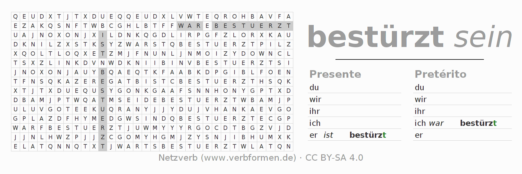 Caça-palavras para todas as formas do verbo bestürzen