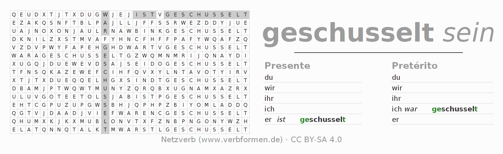 Com o caça-palavras aprende-se de uma forma desafiadora a conjugação do verbo schusseln.