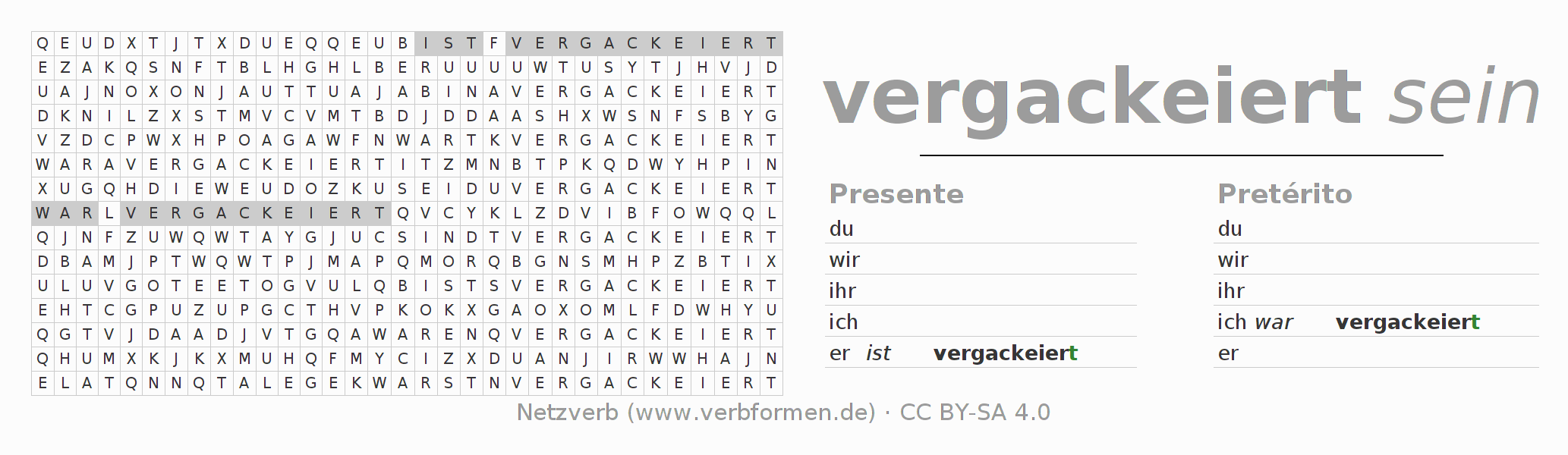 Com o caça-palavras aprende-se de uma forma desafiadora a conjugação do verbo vergackeiern.