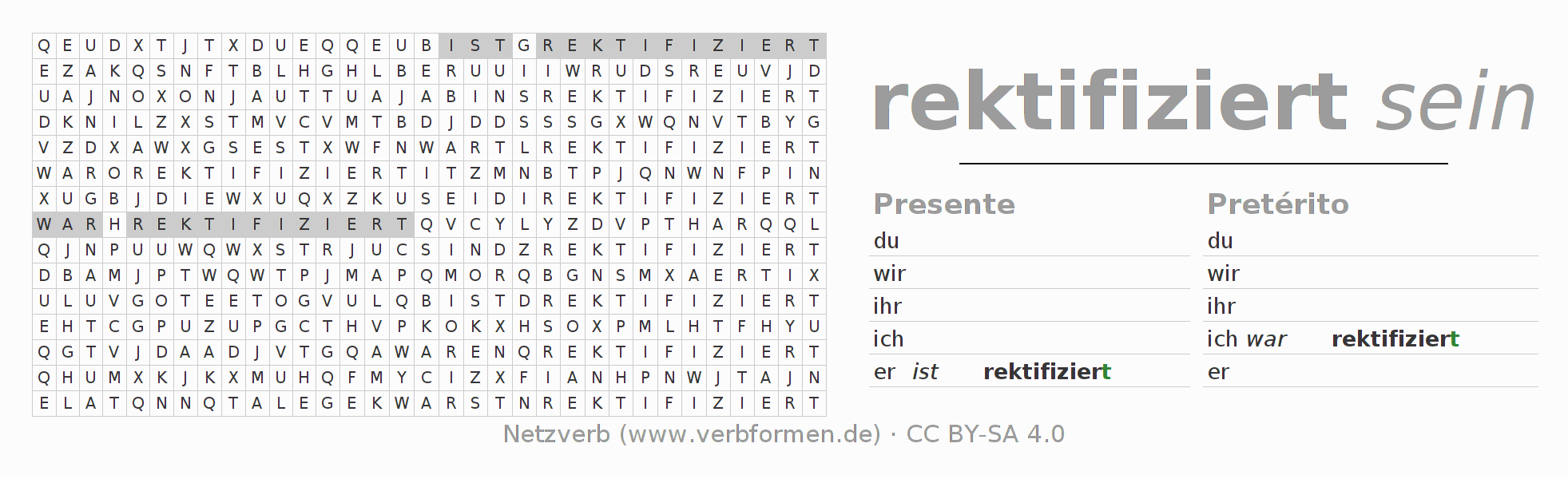 Caça-palavras para todas as formas do verbo rektifizieren