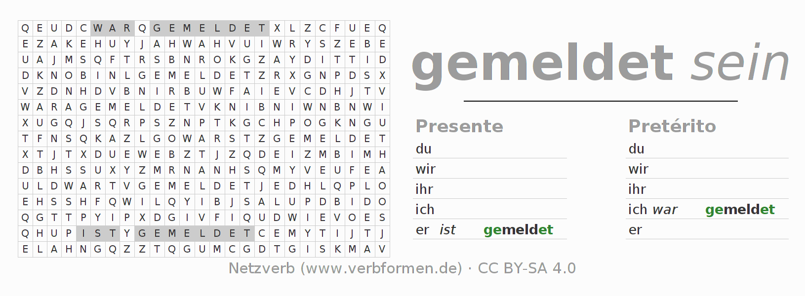 Com o caça-palavras aprende-se de uma forma desafiadora a conjugação do verbo sich melden.
