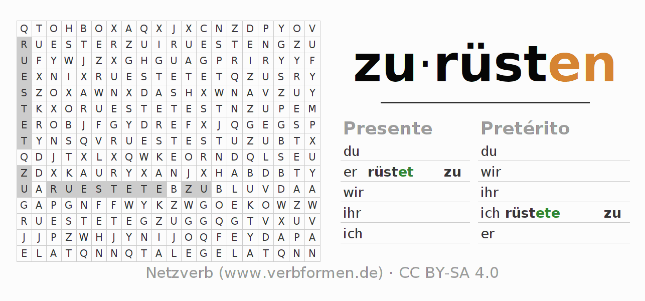 As planilhas são geralmente usadas no ensino para a Conjugação do verbo zurüsten. Os materiais podem ser utilizados como Recursos Educacionais Abertos (OER) em exercícios, jogos e tarefas (CC BY-SA 4.0). Existem diferentes tipos de tarefas disponíveis para o verbo zurüsten. Há uma variedade de execícios com uma visão geral e completa da conjugação como por exemplo, caça-palavras e jogos que requerem um aprendizado em conjunto. Todo o material educacional está disponível gratuitamente para download como PDF, como imagem e através uma versão interativa do navegador. Além das tarefas, inúmeros exemplos do verbo zurüsten também auxiliam na utilização do verbo.