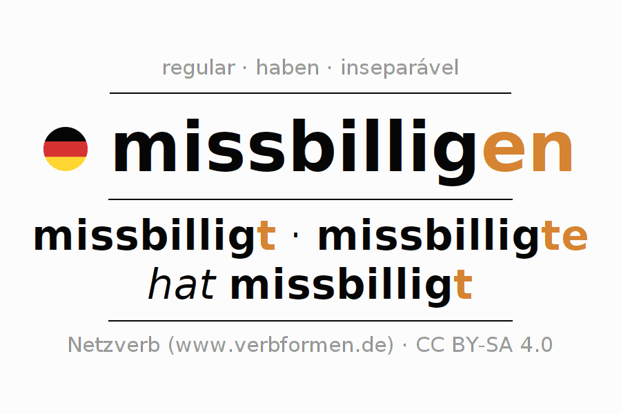 O prefixo miss- de missbilligen é inseparável. A flexão ocorre em Ativo e é usada como Oração principal. Para melhor compreensão estão disponíveis incontáveis. Exemplos do verbo missbilligen . Para a prática e consolidação do estudo