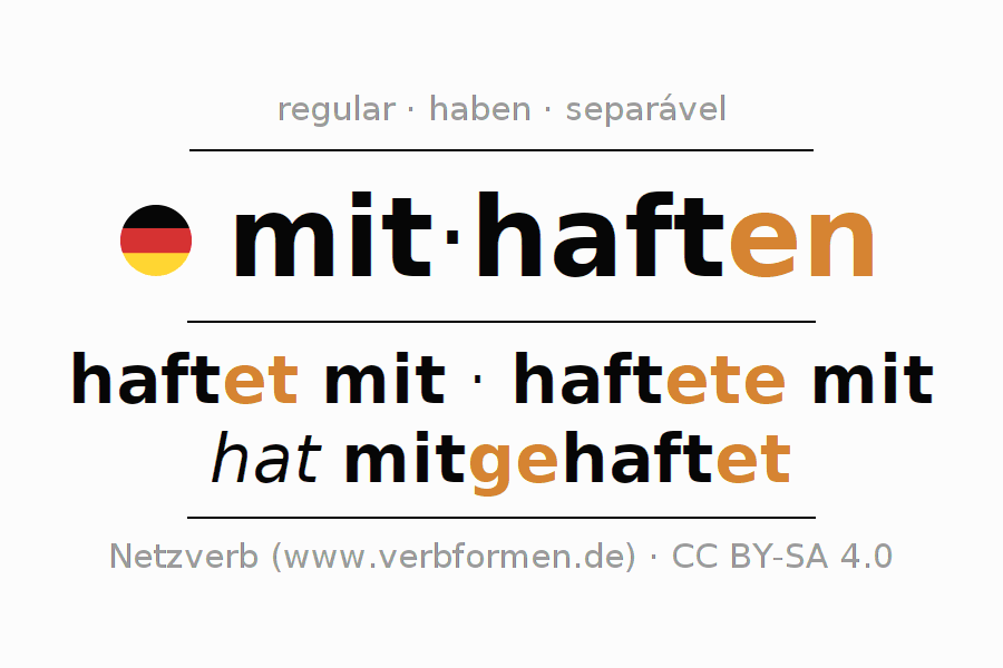 A conjugação do verbo mit·haften é apresentada online assim como a Tabela de Verbo com todas as formas verbais no singular e no plural, e em todas as pessoas (1ª pessoa, 2ª pessoa, 3ª pessoa) A flexão do verbo mit·haften é portanto, uma ajuda para os trabalhos de casa, testes, exames, aulas de alemão, para o estudo do alemão como língua estrangeira, como segunda língua e também na formação de adultos. Especialmente no aprendizado do alemão é importante a conjugação correta do verbo com as respectivamente formas flexionadas corretamente (haftet mit - haftete mit - hat mitgehaftet). Mais informações podem ser encontradas no Wiktionary mithaften e no Duden mithaften.