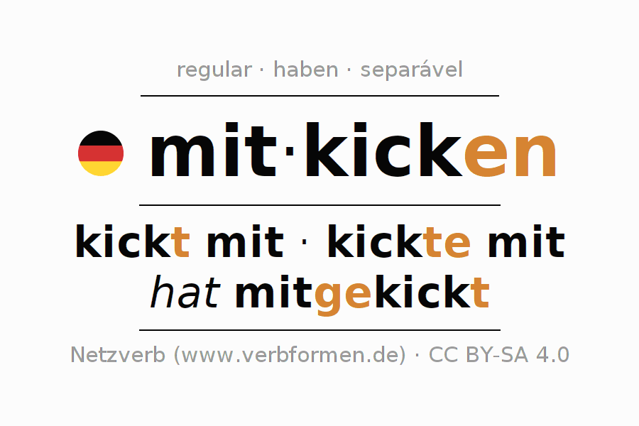 A conjugação do verbo mitkicken (jogar junto, participar) é regular. As formas mais comuns são kickt mit, kickte mit e hat mitgekickt. O verbo auxilar para mitkicken é "haben".