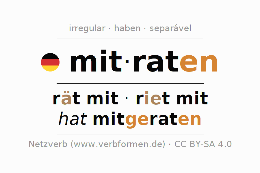 A conjugação do verbo mitraten (adivinhar juntos, participar juntos) é irregular. As formas mais comuns são rät mit, riet mit e hat mitgeraten. A apofonia é feita com a vogal do radical a