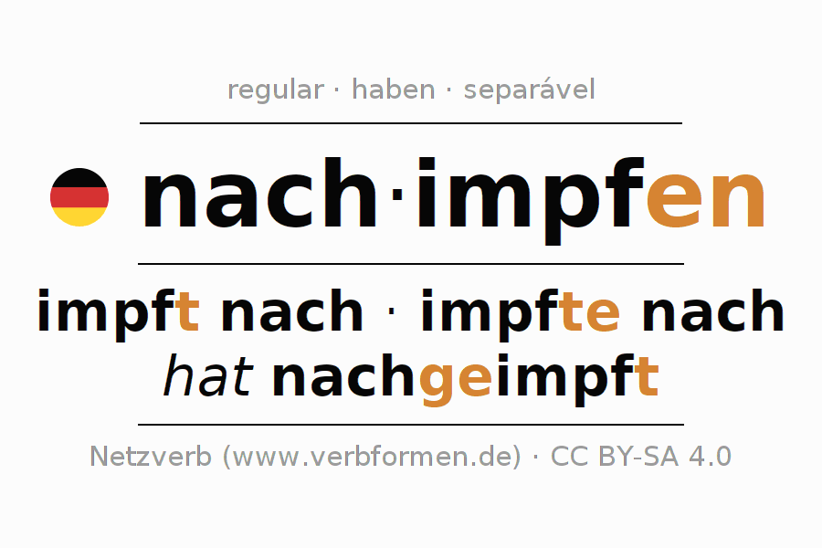 A conjugação do verbo nachimpfen (revacinação, reforço) é regular. As formas mais comuns são impft nach, impfte nach e hat nachgeimpft. O verbo auxilar para nachimpfen é "haben".