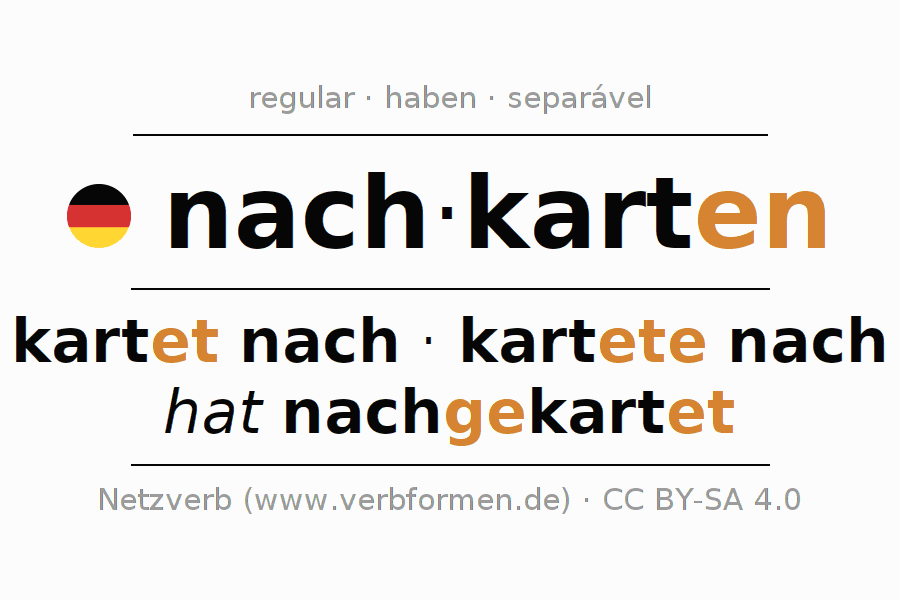A conjugação do verbo nachkarten (voltar ao assunto, criticar) é regular. As formas mais comuns são kartet nach, kartete nach e hat nachgekartet. O verbo auxilar para nachkarten é "haben".