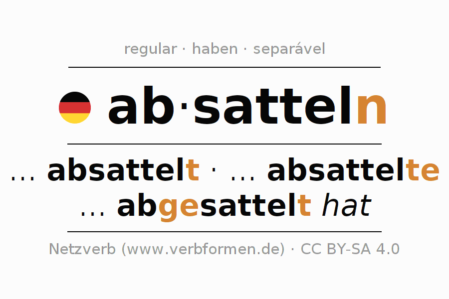 A conjugação do verbo absatteln (desmontar, desselar) é regular. As formas mais comuns são ... absattelt, ... absattelte e ... abgesattelt hat. O verbo auxilar para absatteln é "haben".