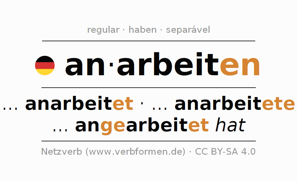O prefixo an - de anarbeiten é separável. A flexão ocorre em Ativo e é usada como Oração subordinada. Para melhor compreensão estão disponíveis incontáveis. Exemplos do verbo anarbeiten . Para a prática e consolidação do estudo