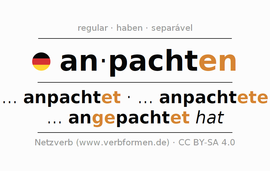 A conjugação do verbo anpachten (alugar, arrendar) é regular. As formas mais comuns são ... anpachtet, ... anpachtete e ... angepachtet hat. O verbo auxilar para anpachten é "haben".