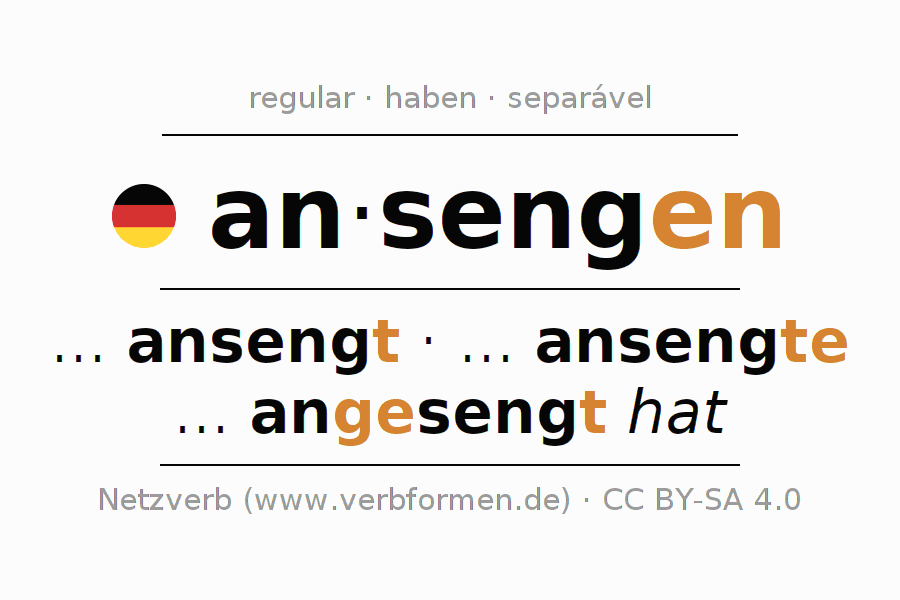 A conjugação do verbo ansengen (chamuscar, queimar superficialmente) é regular. As formas mais comuns são ... ansengt, ... ansengte e ... angesengt hat. O verbo auxilar para ansengen é "haben".