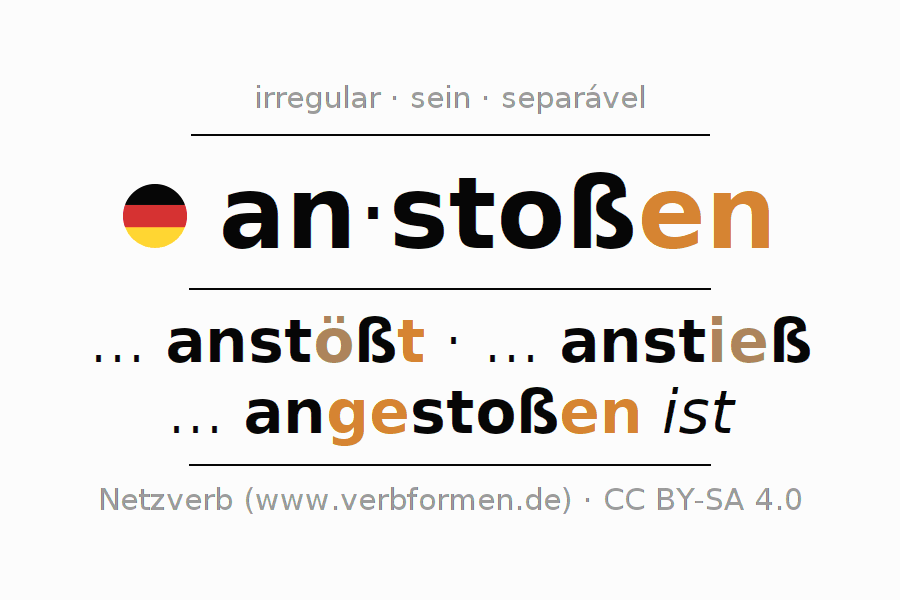 A conjugação do verbo anstoßen (bater contra, bater em) é irregular. As formas mais comuns são ... anstößt, ... anstieß e ... angestoßen ist. A apofonia é feita com a vogal do radical o