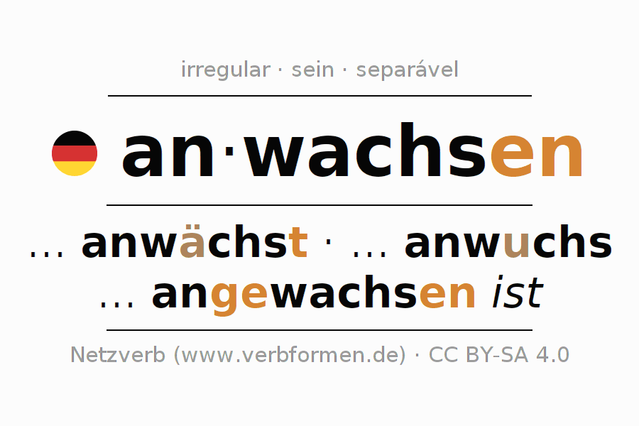 A conjugação do verbo anwachsen (aumentar, crescer) é irregular. As formas mais comuns são ... anwächst, ... anwuchs e ... angewachsen ist. A apofonia é feita com a vogal do radical a