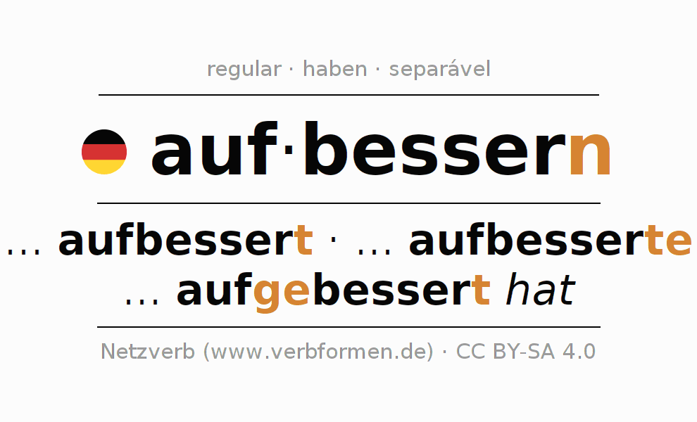 A conjugação do verbo aufbessern (aperfeiçoar, melhorar) é regular. As formas mais comuns são ... aufbessert, ... aufbesserte e ... aufgebessert hat. O verbo auxilar para aufbessern é "haben".