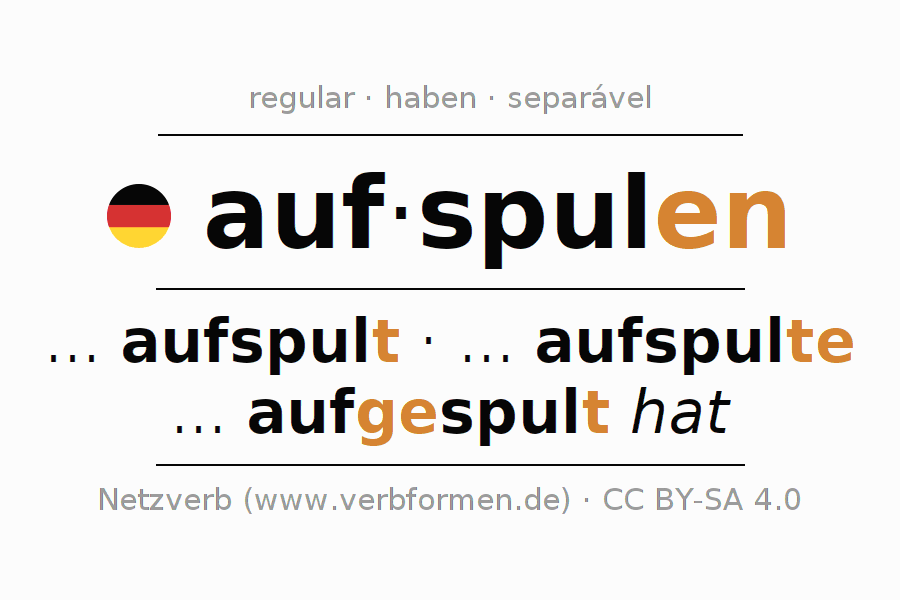 A conjugação do verbo aufspulen (enrolar, bobinar) é regular. As formas mais comuns são ... aufspult, ... aufspulte e ... aufgespult hat. O verbo auxilar para aufspulen é "haben".