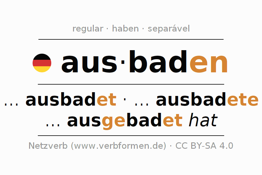 A conjugação do verbo ausbaden (arcar, pagar) é regular. As formas mais comuns são ... ausbadet, ... ausbadete e ... ausgebadet hat. O verbo auxilar para ausbaden é "haben".