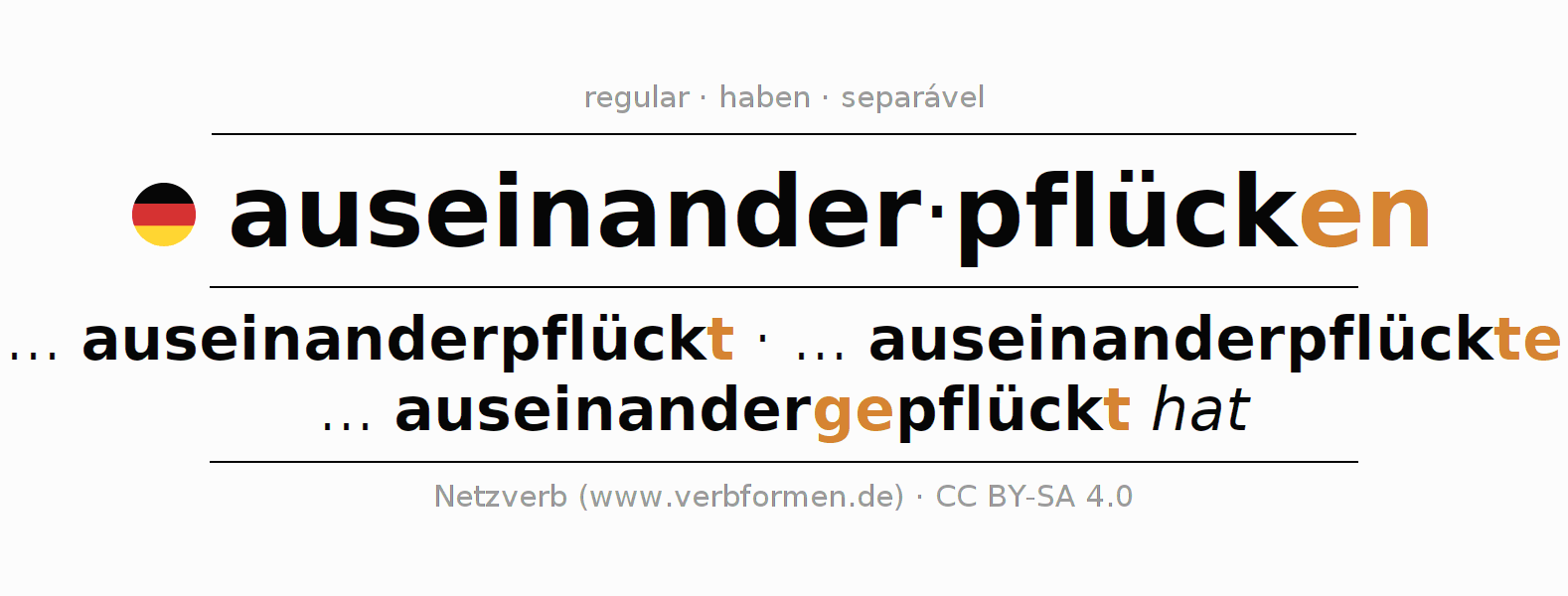 A conjugação do verbo auseinanderpflücken (analisar criticamente, desmembrar) é regular. As formas mais comuns são ... auseinanderpflückt, ... auseinanderpflückte e ... auseinandergepflückt hat. O verbo auxilar para auseinanderpflücken é "haben".