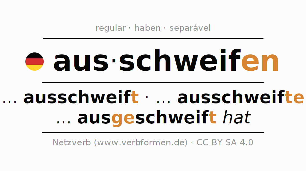 O prefixo aus - de ausschweifen é separável. A flexão ocorre em Ativo e é usada como Oração subordinada. Para melhor compreensão estão disponíveis incontáveis. Exemplos do verbo ausschweifen . Para a prática e consolidação do estudo