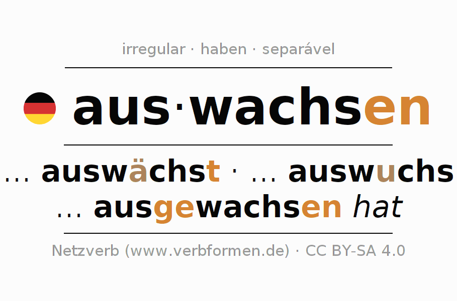 A conjugação do verbo auswachsen (crescer, desaparecer) é irregular. As formas mais comuns são ... auswächst, ... auswuchs e ... ausgewachsen hat. A apofonia é feita com a vogal do radical a